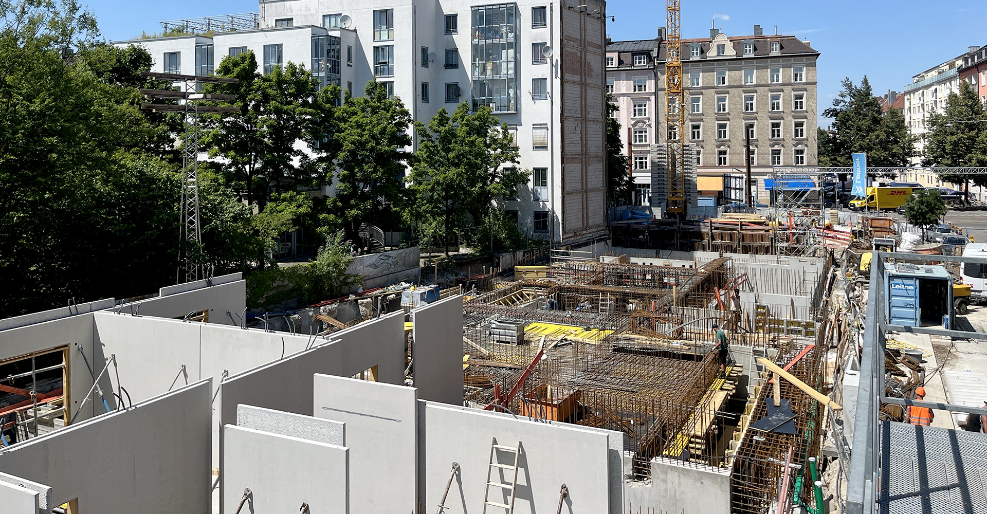 Bei dem Neubauvorhaben Virchowstraße 1 in Schwabing wurden die Arbeiten auch über den Winter nicht eingestellt. Der Rohbau ist fertiggestellt, das Dach bis Ende Februar komplett. Im März werden bereits Fenster und Außentüren gesetzt, sodass der Gebäudekörper geschlossen ist. Von da ab werden die Innenausbauten – unabhängig der Witterung – zügig voranschreiten können. Schon jetzt ist das großzügige Raumgefühl in den ohnehin hellen Wohnungen und der schöne Ausblick von den beiden Dachgeschoss-Wohnungen erlebbar.